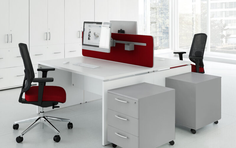 OGI_V – Die Flexibilität der Serie ermöglicht eine leichte Gestaltung und Umgestaltung. Eine breite Palette an Schreibtischen wie der Bürotisch OGI_V ermöglicht die Bildung von Einzel- und Team-Arbeitsplätzen. Die Wangenfüße und Knieblende bedecken ästhetisch die Kabel, wodurch der Arbeitsplatz aufgeräumt bleibt. Die schlichten Formen der Möbel sorgen für Harmonie und Ordnung, wodurch die Konzentration bei der Arbeit gefördert wird.