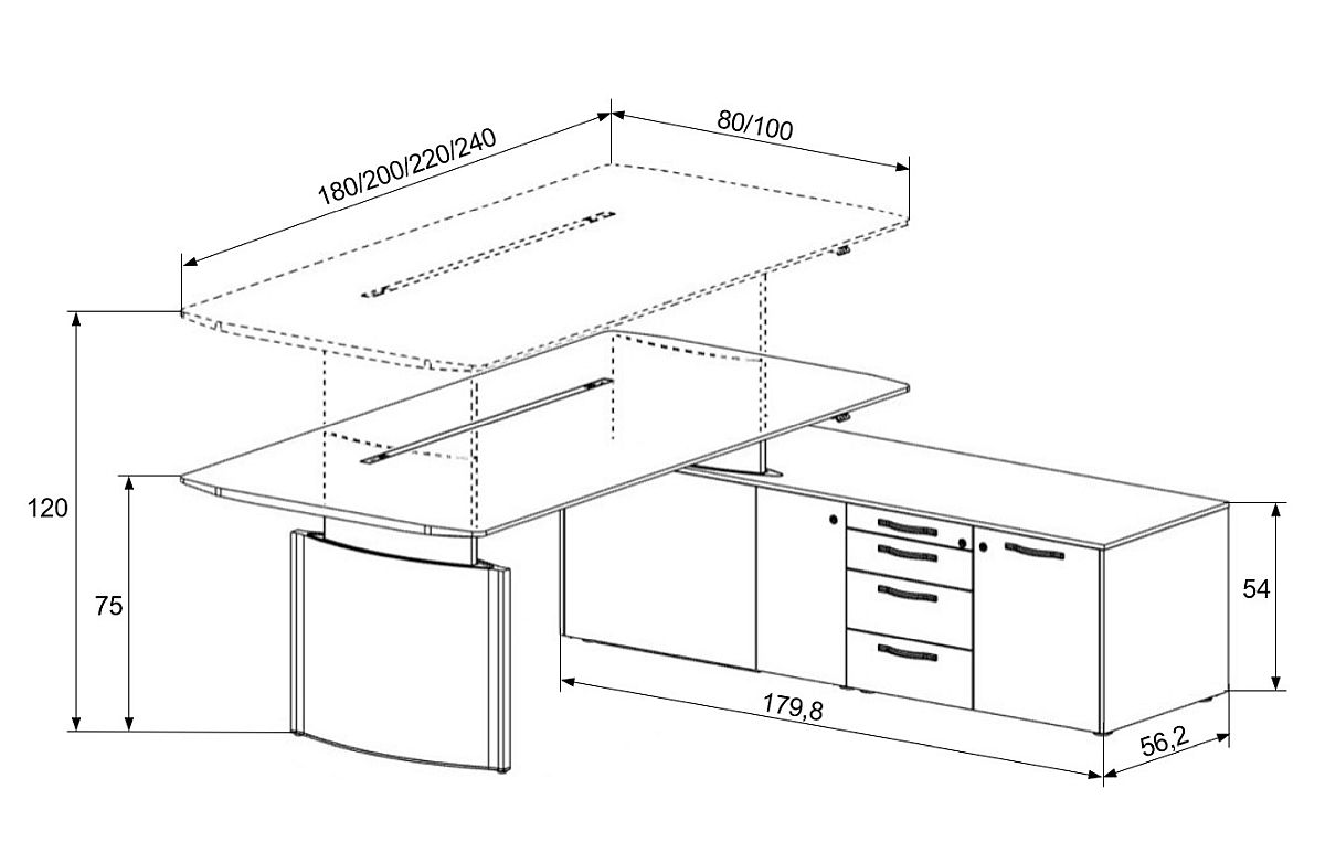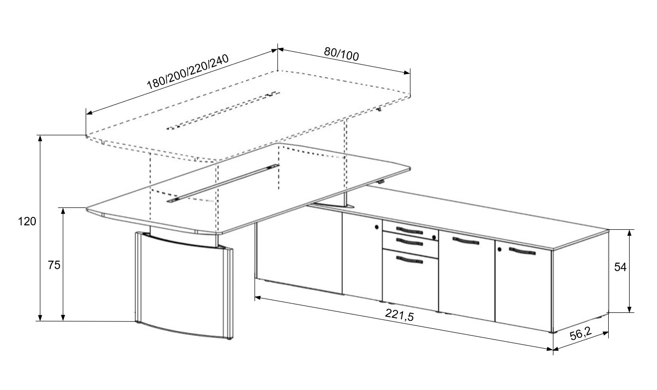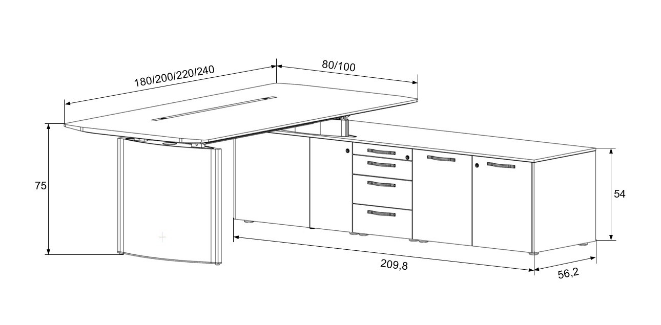 Abmessungen – Chefschreibtisch in folgenden Größen erhältlich (BxTxH):