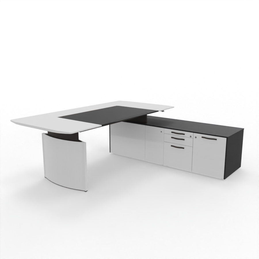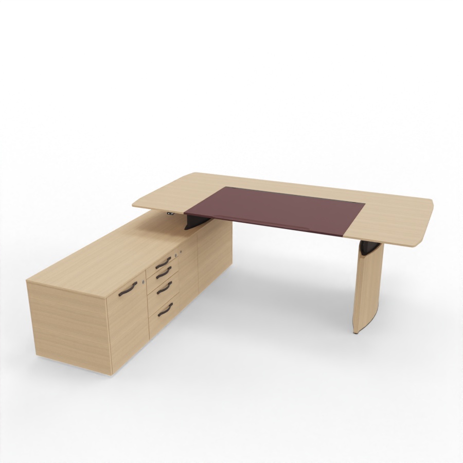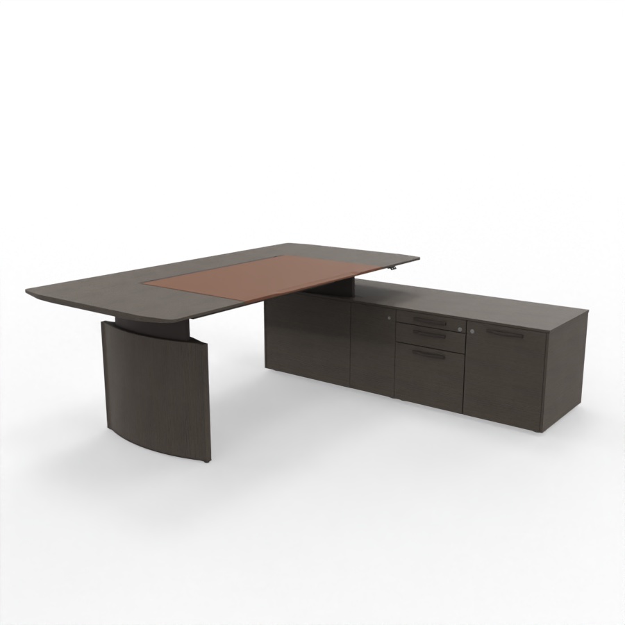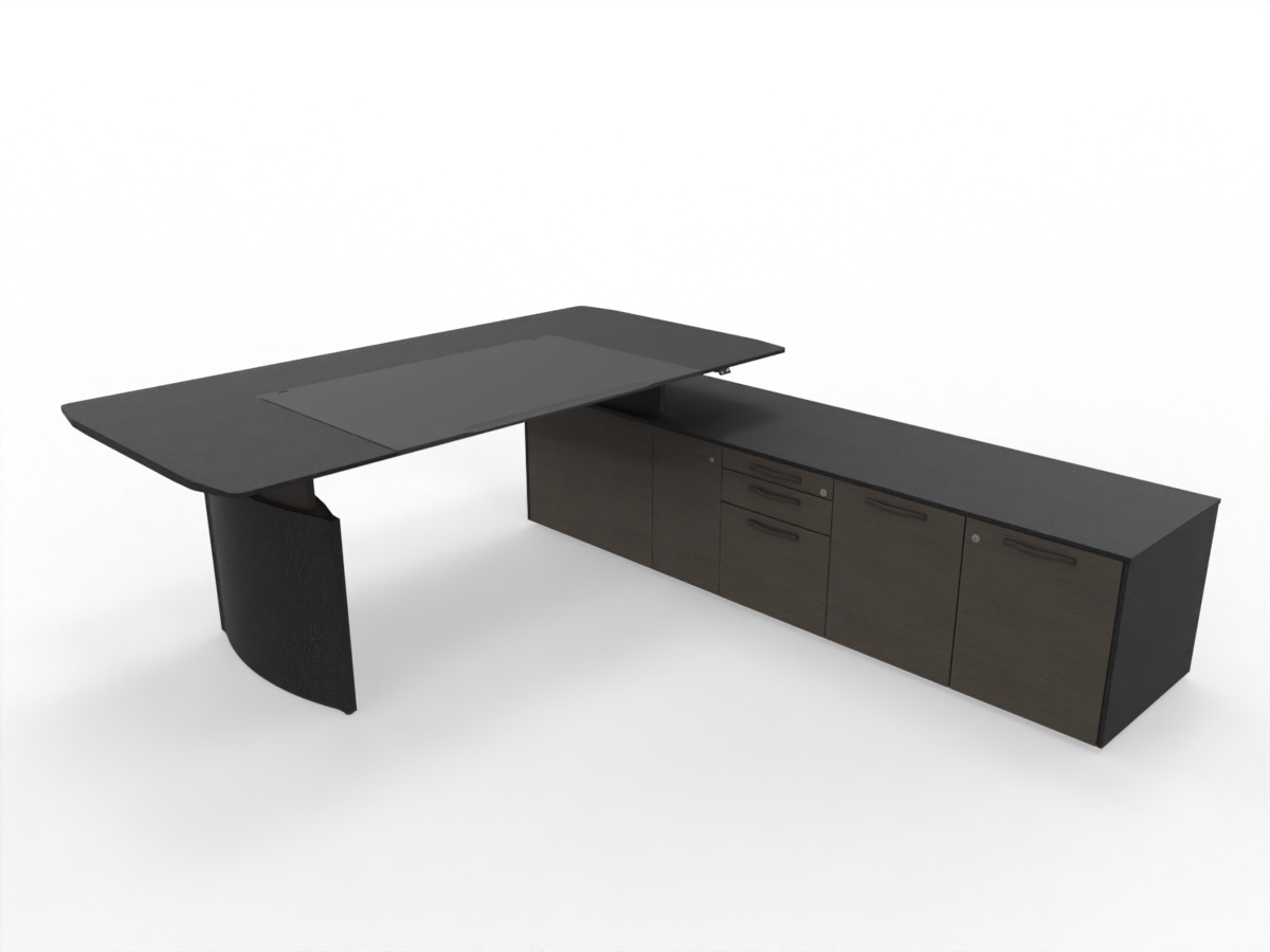 Chefschreibtisch Eleva, elektrisch höhenverstellbar mit Sideboard und integrierter Schreibtischunterlage – hier vereinen sich Ergonomie und anspruchsvolles Design!