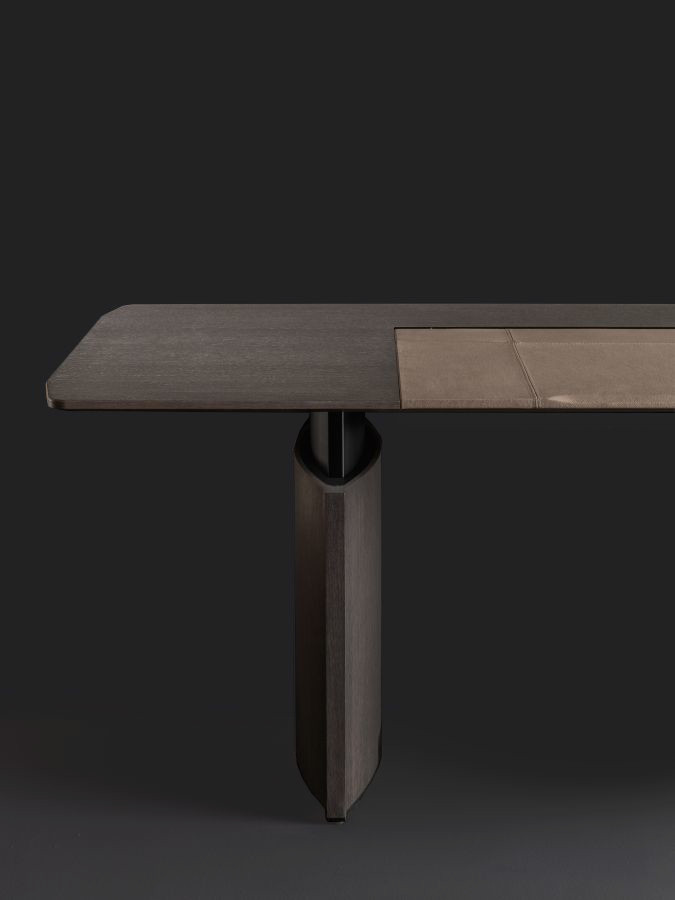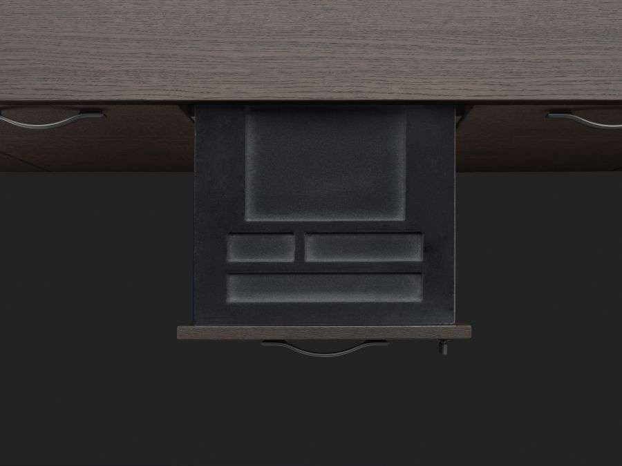 Die massive Furniertischplatte erhält dank der konisch zulaufenden Ränder ihre einmalige Form. Ein weiterer Eyecatcher ist die dekorative Metallleiste auf der Tischplatte, an deren Enden jeweils ein ausziehbarer Auslass integriert ist. Hierbei wird Ihnen ein einfaches Kabelmanagement ermöglicht. Die eingelassene Schreibtischunterlage aus Kunstleder ermöglicht ein sehr angenehmes Arbeiten und betont zudem das hochwertige Design.