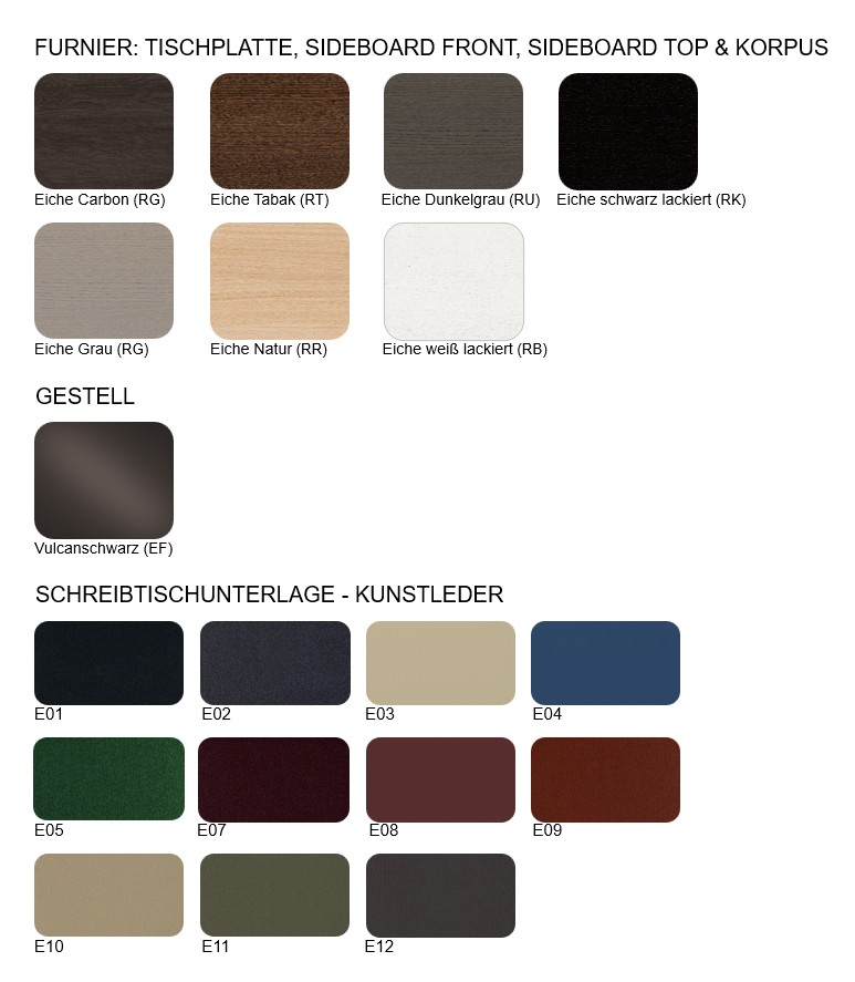 - Furnier – Tischplatte & Beinverkleidung: Eiche Grau (RG), Eiche Carbon (RC), Eiche Tabak (RT), Eiche Dunkelgrau (RU), Eiche schwarz lackiert (RK), Eiche Natur (RR), Eiche weiß lackiert (RB)