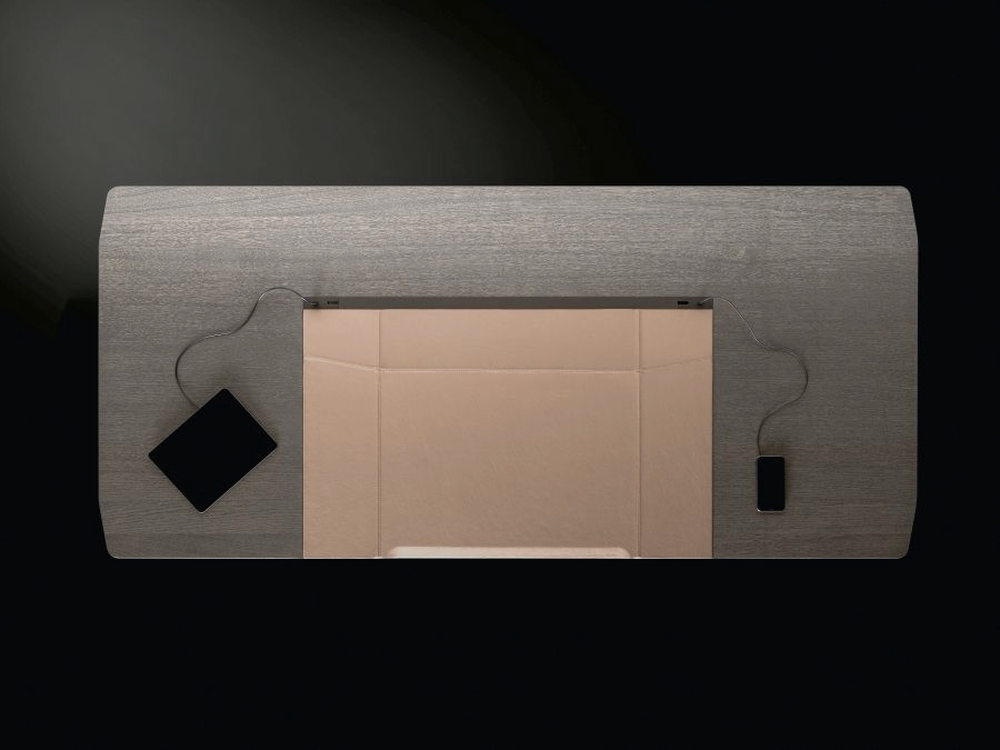 Die massive Furniertischplatte erhält dank der konisch zulaufenden Ränder ihre einmalige Form. Ein weiterer Eyecatcher ist die dekorative Metallleiste auf der Tischplatte, an deren Enden jeweils ein ausziehbarer Kabelauslass integriert ist. Hierbei wird Ihnen ein einfaches Kabelmanagement ermöglicht. Die eingelassene Schreibtischunterlage aus Kunstleder ermöglicht ein sehr angenehmes Arbeiten und betont zudem das hochwertige Design.