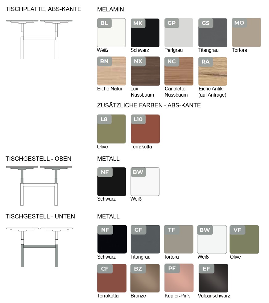 Die 18 mm starken melaminharzbeschichteten Tischpatten sind in 9 modernen Dekorfarben erhältlich. Die ABS-Kanten lassen sich gegen Aufpreis und Anfrage auch unabhängig der Platte in 11 modernen Farben auswählen. Das qualitativ hochwertige Gestell bietet die perfekte Basis für den elektrisch höhenverstellbaren Teamarbeitsplatz. Zwischen den beiden Tischhälften ist ein Abstand von 4 cm vorhanden, der als Kabeldurchführung oder zur Montage von Sichtschutzpaneelen genutzt werden kann.