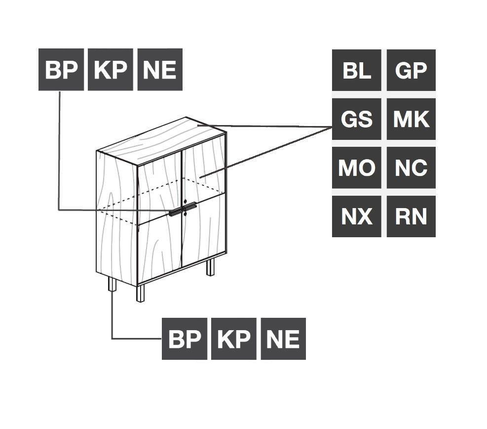 • Top & Seitenteile: Weiß (BL), Perlgrau (GP), Titangrau (GS), Schwarz (MK), Canaletto Nussbaum (NC), Eiche Natur (RN),  Tortora (MO), Lux Nussbaum (NX)