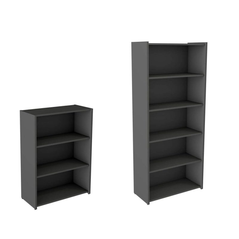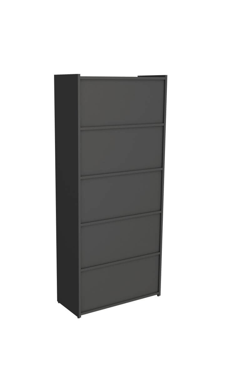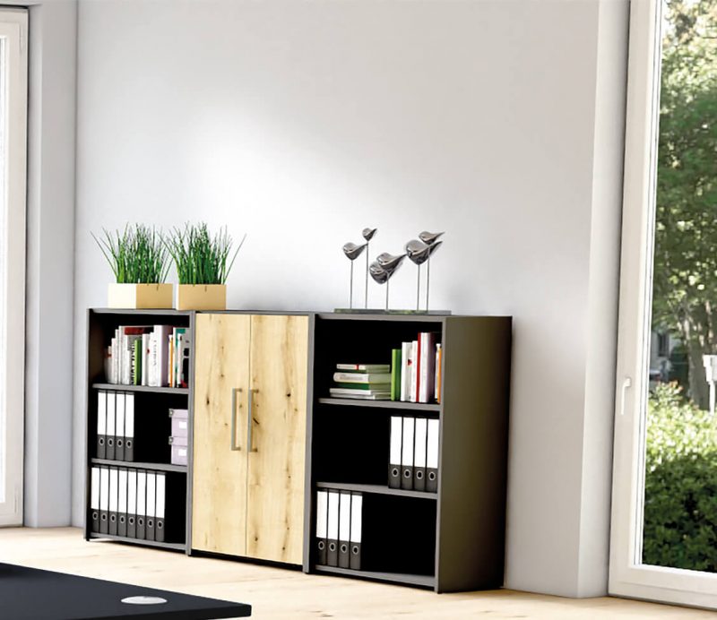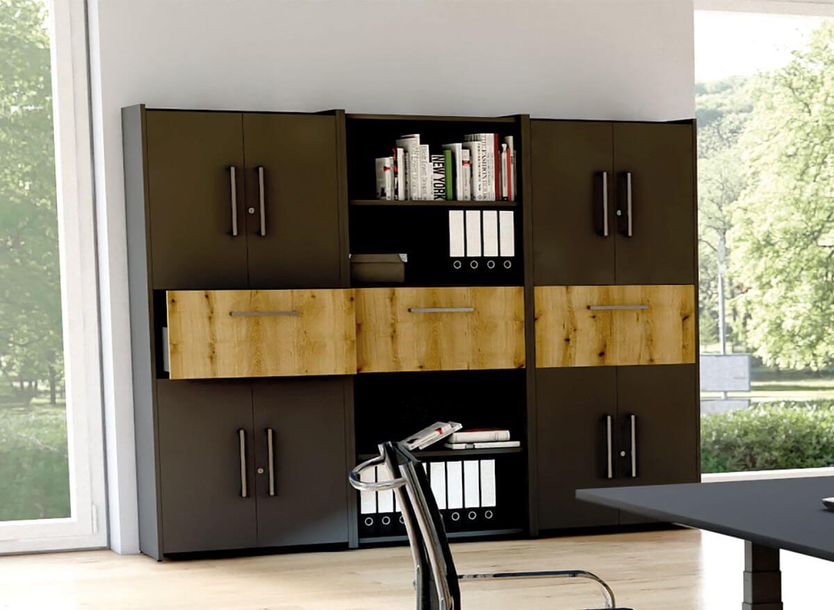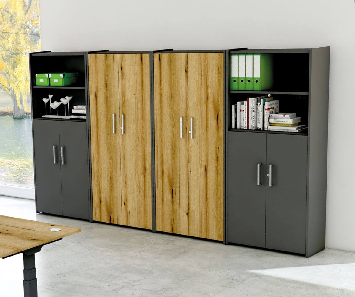 Der Regalbereich bietet vielfältige Kombinationsmöglichkeiten. Der Korpus aus melaminharzbeschichteten Holzplatten, generell in anthrazit, kann durch abschließbare Holztüren in 3 OH oder 5 OH (Anthrazit oder Asteiche) und durch Schubladen bzw. Schubladen für Hängeregistratur vervollständigt werden. Die Regale haben eine Sichtrückwand, können also auch frei im Raum aufgestellt werden. Die Stellfüße ermöglichen ein exaktes Ausrichten, auch auf leichten Bodenunebenheiten.