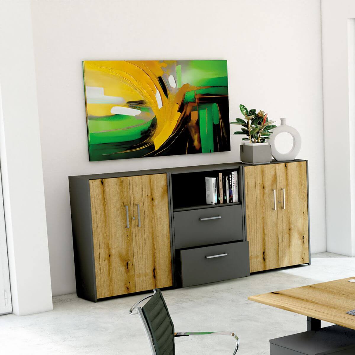 Trendige Büro-Ästhetik: Anthrazit trifft Asteiche.