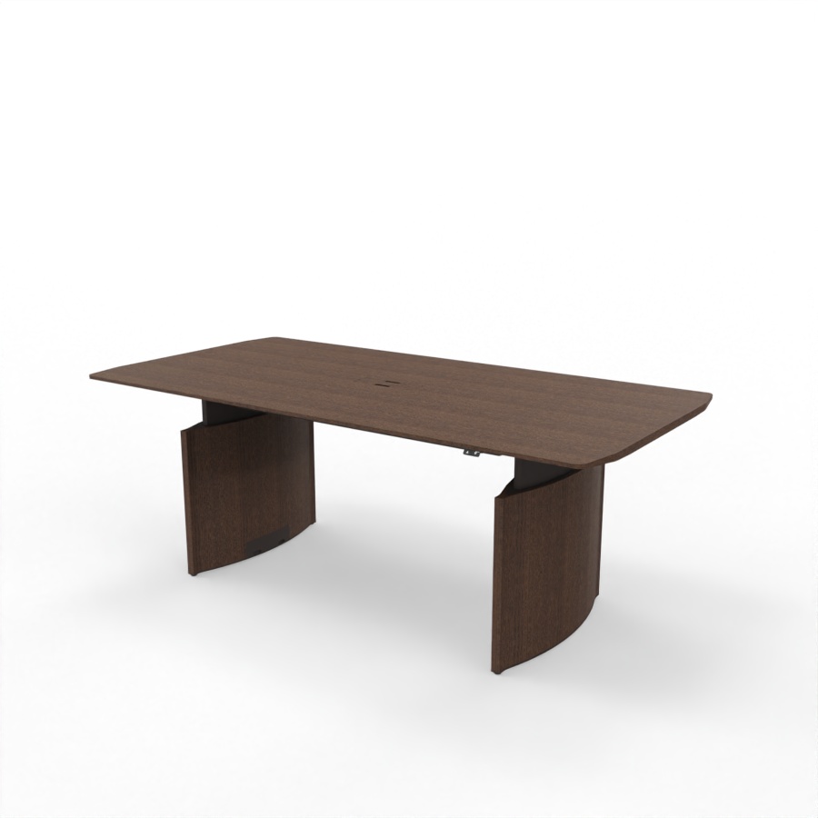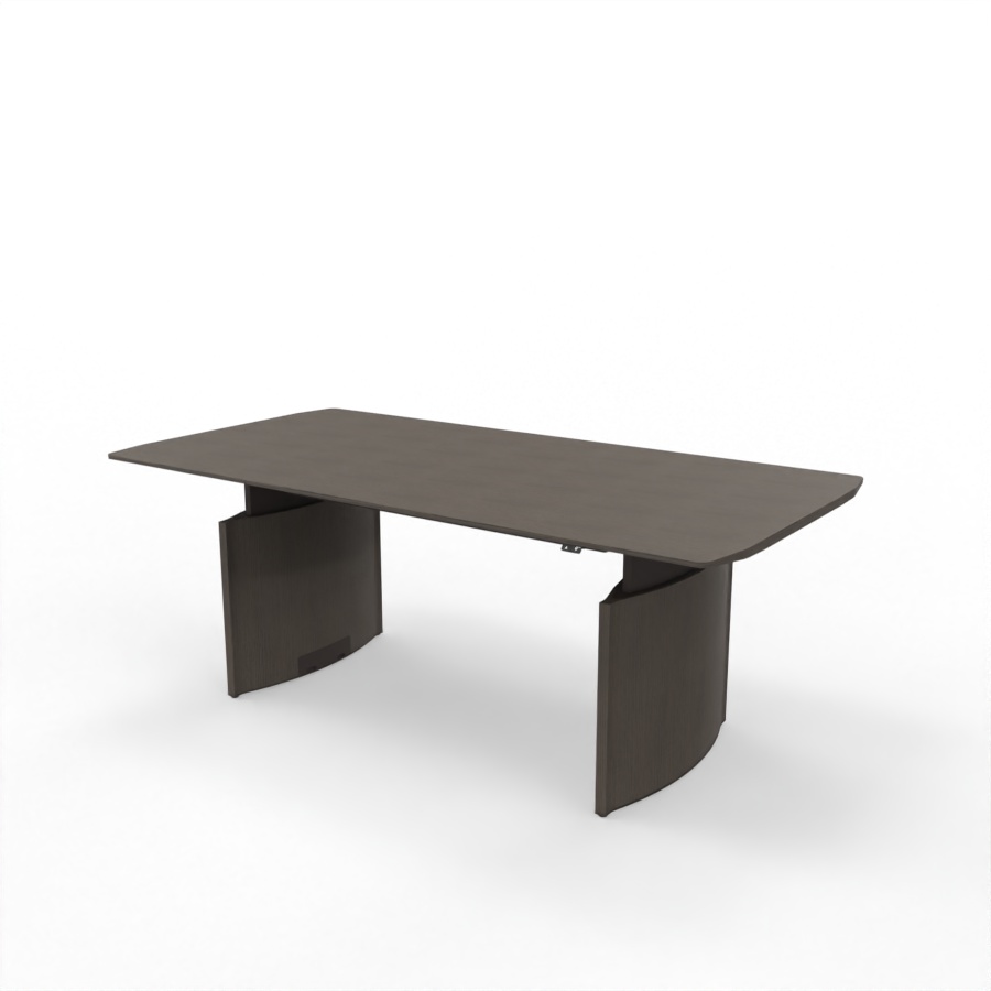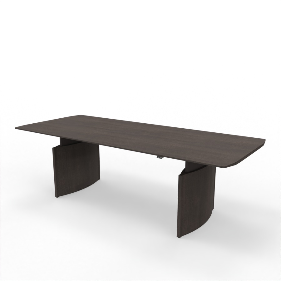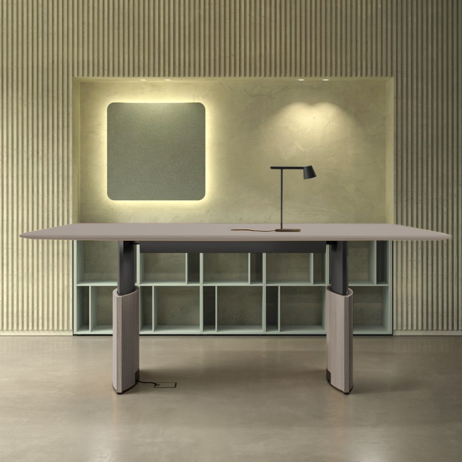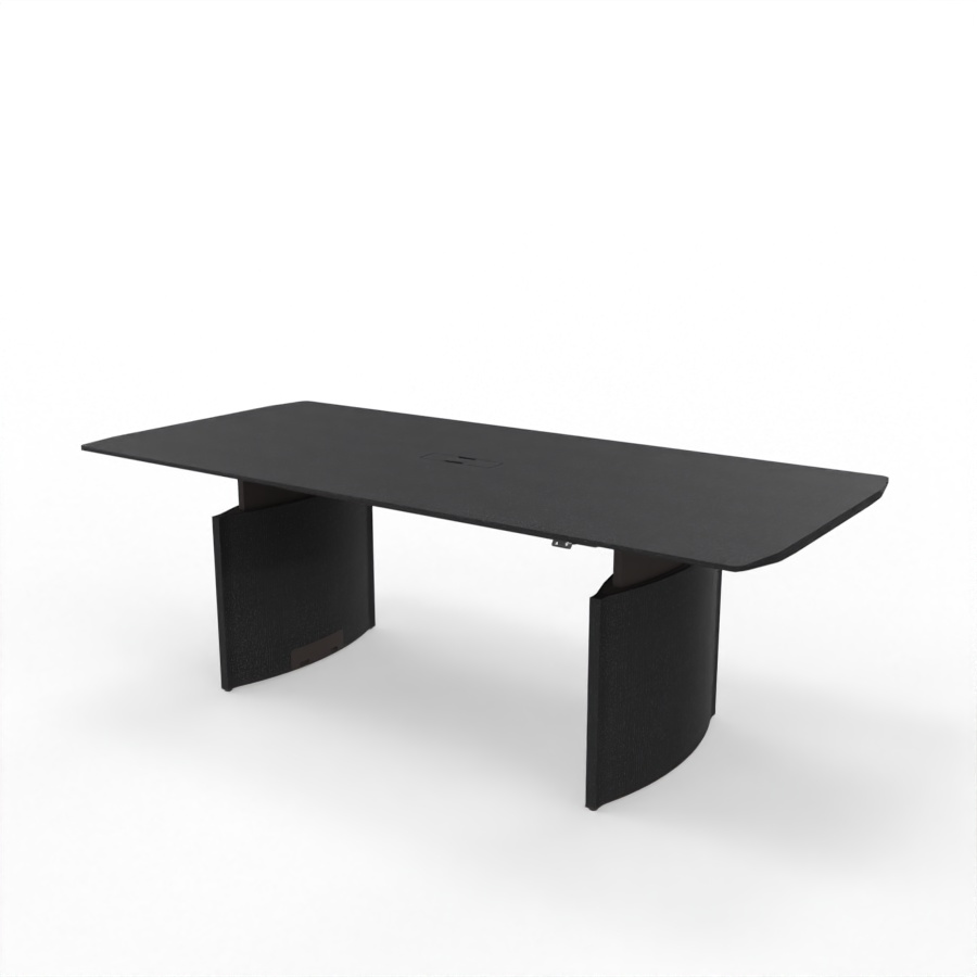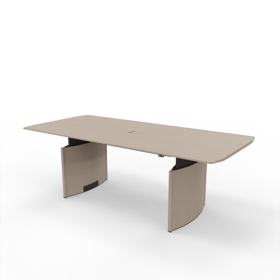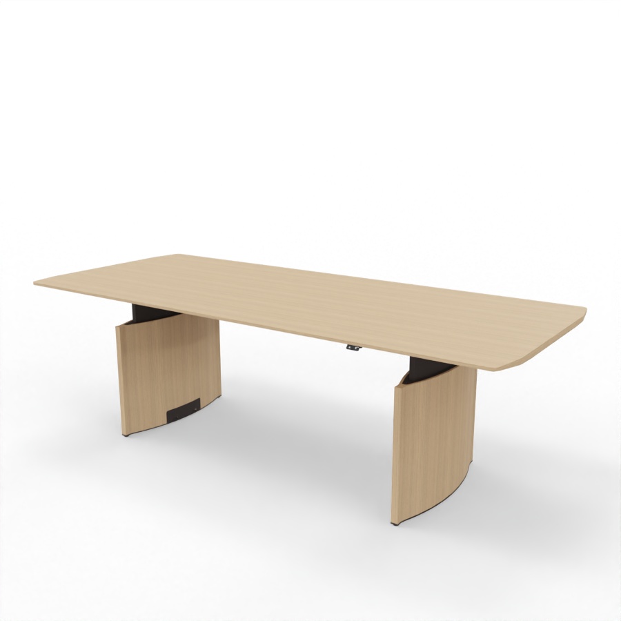 Der Besprechungstisch verfügt über zwei hochwertige, verstellbare Metallbeine, die eine solide Basis bilden. Die elliptisch geformten und mit Eiche furnierten Gestellbeine sind in der gleichen Farbe wie die Tischplatte lackiert und runden das Gesamtbild ab. Wahlweise lässt sich der Tisch für den Zugang von oben mit einer Kabelklappe bestücken, deren Oberfläche aus Holz in derselben Ausführung wie die Tischplatte ist.