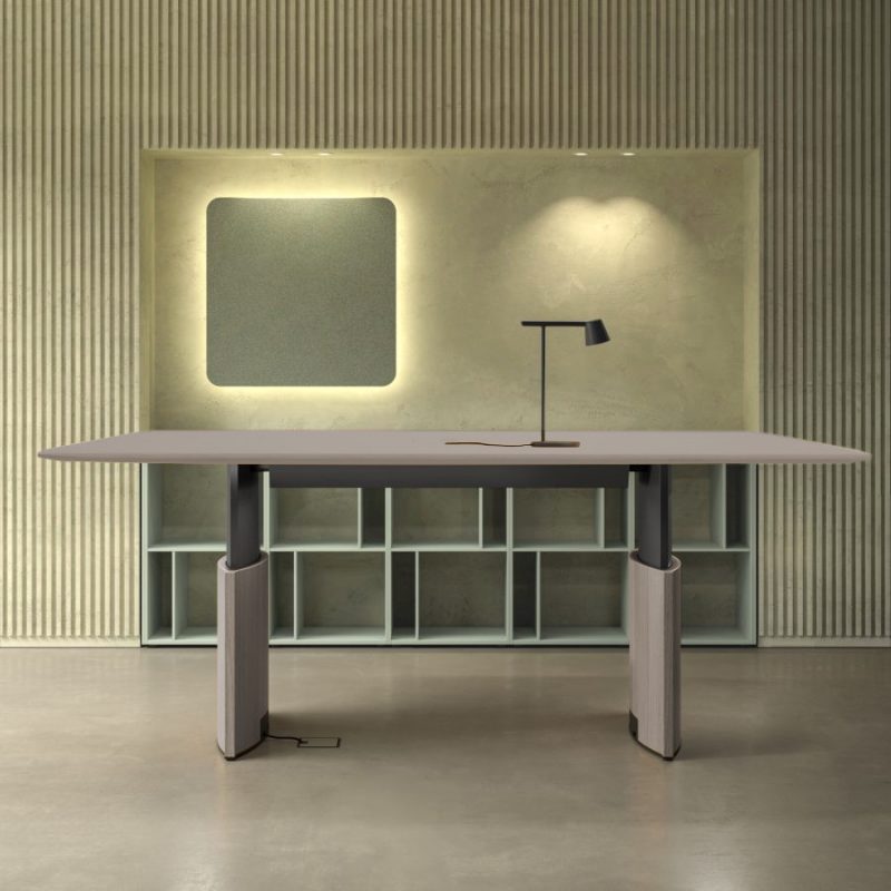 Elegantes Design verbunden mit Ergonomie, bietet Ihnen der Meetingtisch Eleva. Hergestellt aus hochwertigen Materialien beeindruckt der Tisch mit einer massiven Tischplatte aus Echtholzfurnier die sich jederzeit elektrisch in der Höhe verstellen lässt. So ist ein Wechsel zwischen Sitzen und Stehen selbst während Besprechungen kein Thema mehr. Hierbei lässt sich die Höhe im Bereich von 75 bis 120 cm hervorragend an die jeweiligen Bedürfnisse der Personen anpassen.