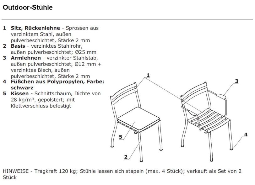 • Beine/Rahmen: verzinktes Stahlrohr, außen pulverbeschichtet; ⌀ 25 mm