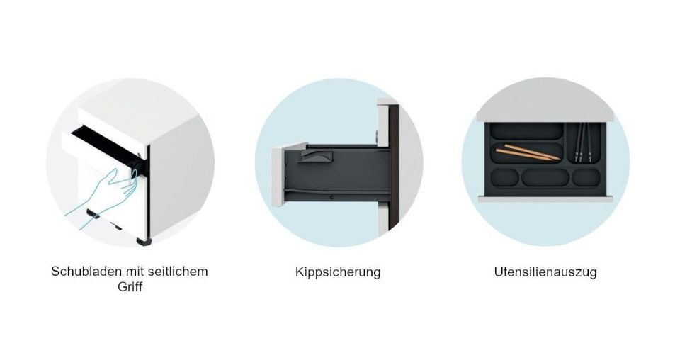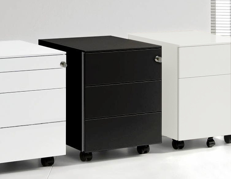Platzmangel auf dem Schreibtisch ist ein lästiges Thema im Arbeitsleben. Der Rollcontainer verschafft Ihnen Abhilfe. Ausgestattet mit Schwenkrollen, lässt er sich ohne Probleme immer griffbereit neben oder unter Ihrem Schreibtisch platzieren. Der Container bietet 3 Metall-Schublade und 1 Schloss. So sind Sie in der Lage Ihre Arbeitsunterlagen und persönlichen Utensilien geordnet und sicher unterzubringen. Wählen Sie aus 4 verschiedenen Dekorfarben Ihren Favoriten.