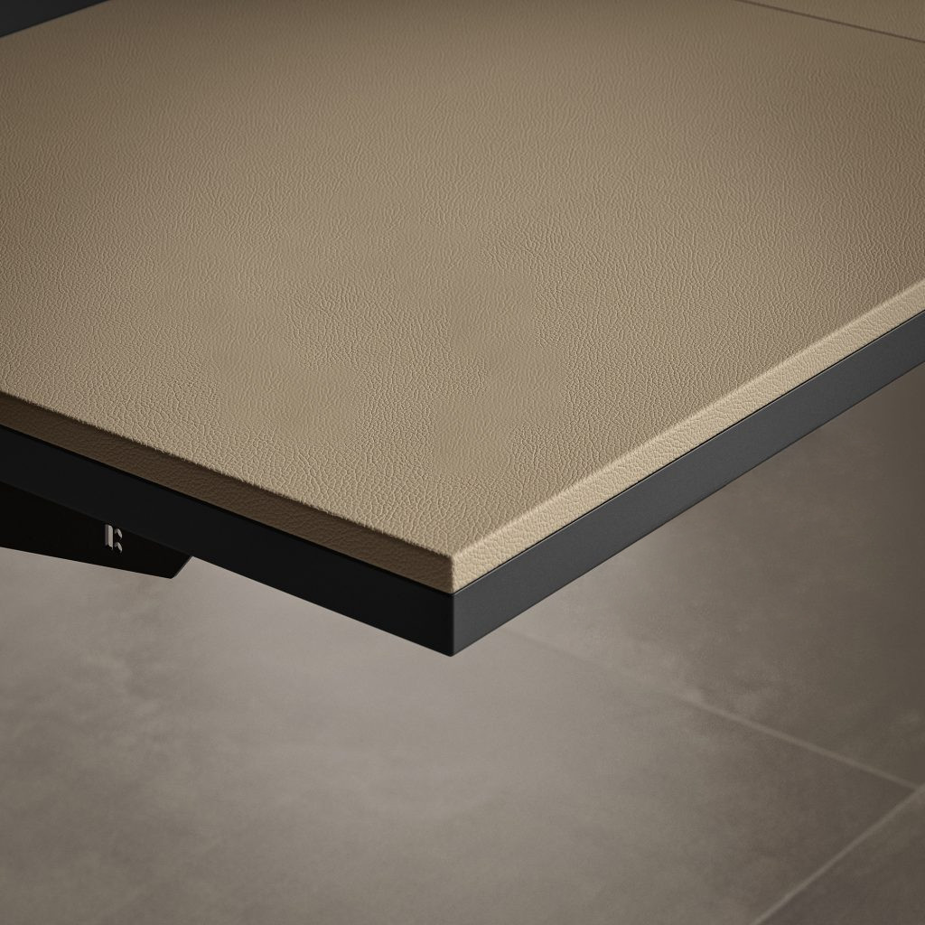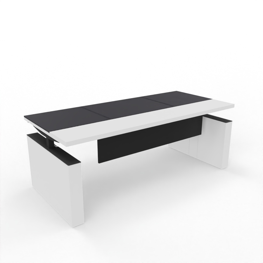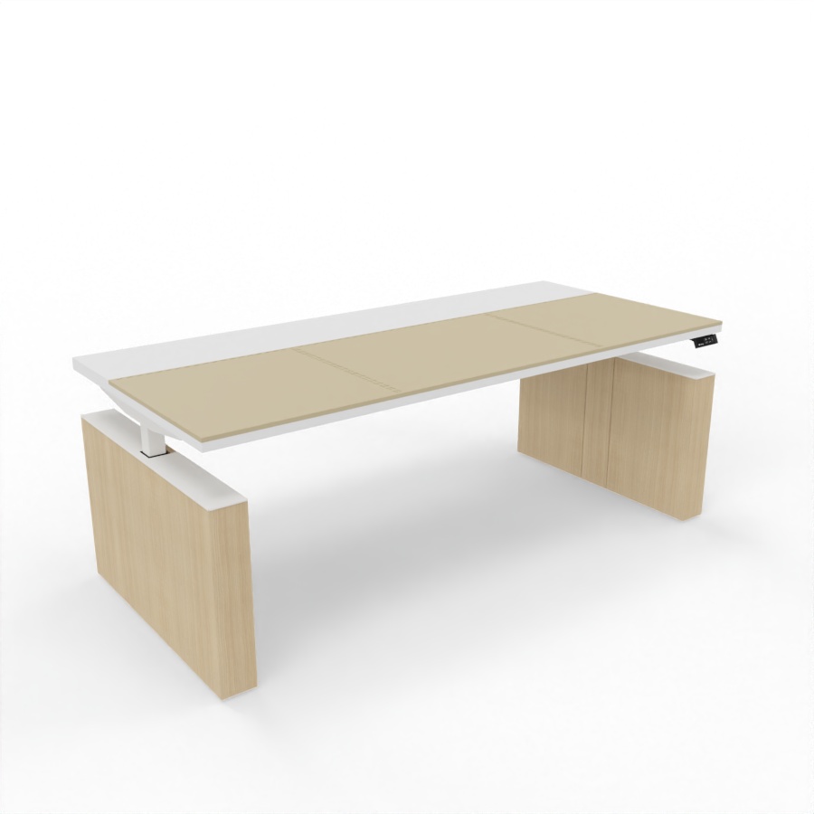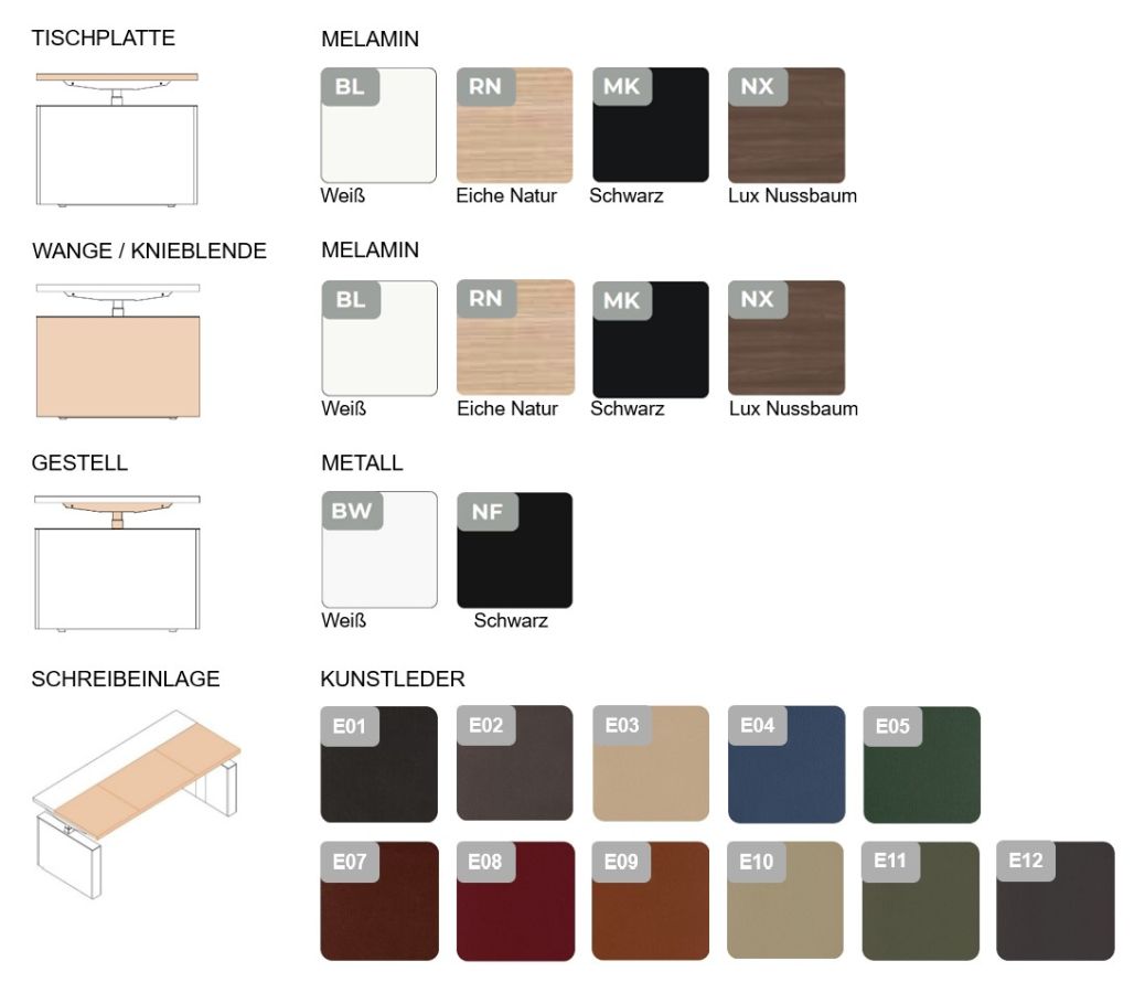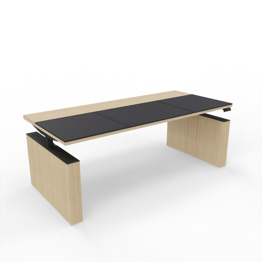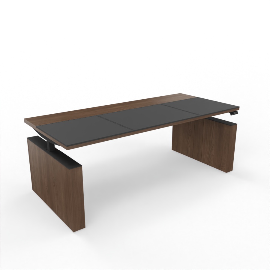 Hergestellt ist der elektrisch höhenverstellbare Chefschreibtisch Sile_e aus 38 mm starken Melamin-Platten die in 4 verschiedenen Dekorfarben wie Weiß, Schwarz, Eiche Natur oder Lux Nussbaum wählbar sind. Die in der Tischplatte eingelassene Kunstledereinlage ermöglicht Ihnen ein sehr angenehmes Arbeiten und betont zudem das hochwertige Design. Der Tisch verfügt über zwei hochwertige, elektrisch höhenverstellbare Metallbeine, die eine starke Basis bilden. Verkleidet mit hochwertige Melamin-Wangen sind diese in denselben Dekorfarben wie die Tischplatte wählbar und aufeinander abstimmbar. Optionale Erweiterung wie Knieraumblende geben dem edlen Design eine besondere Note.