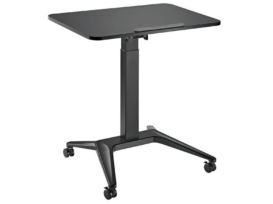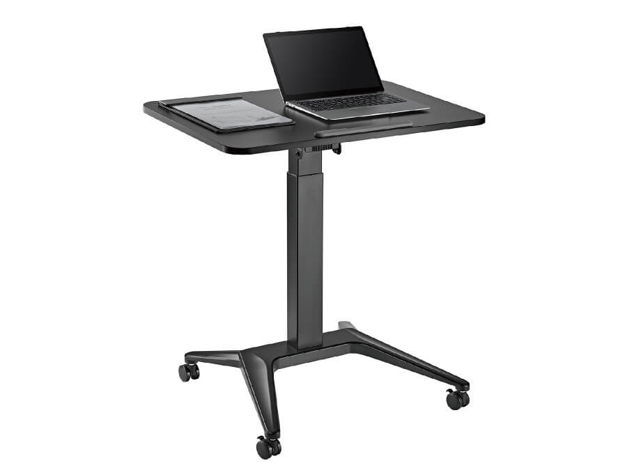 Ein vielseitiger Schreibtisch mit pneumatischer Höhenverstellung. Der Tisch ist nicht nur praktisch, sondern auch platzsparend – eine gute Lösung für mehr Flexibilität am Arbeitsplatz.