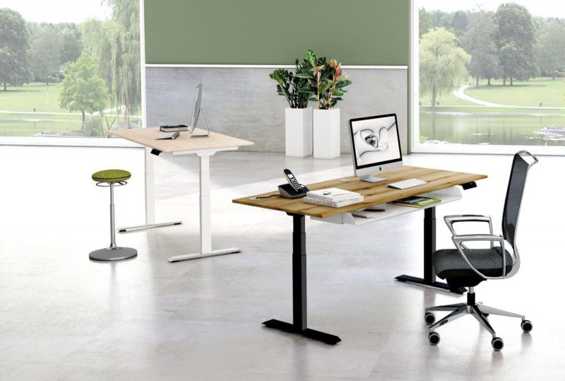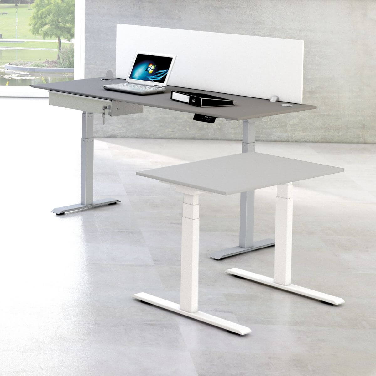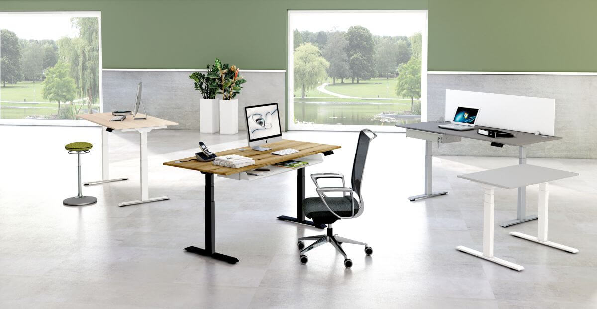 Für besonders rückenschonendes Arbeiten stehen diese komfortablen elektrisch höhenverstellbaren Steh-/Sitztische zur Verfügung. Die elektrische Höhenverstellung verfügt über einen Verstellbereich von 62-127 cm.