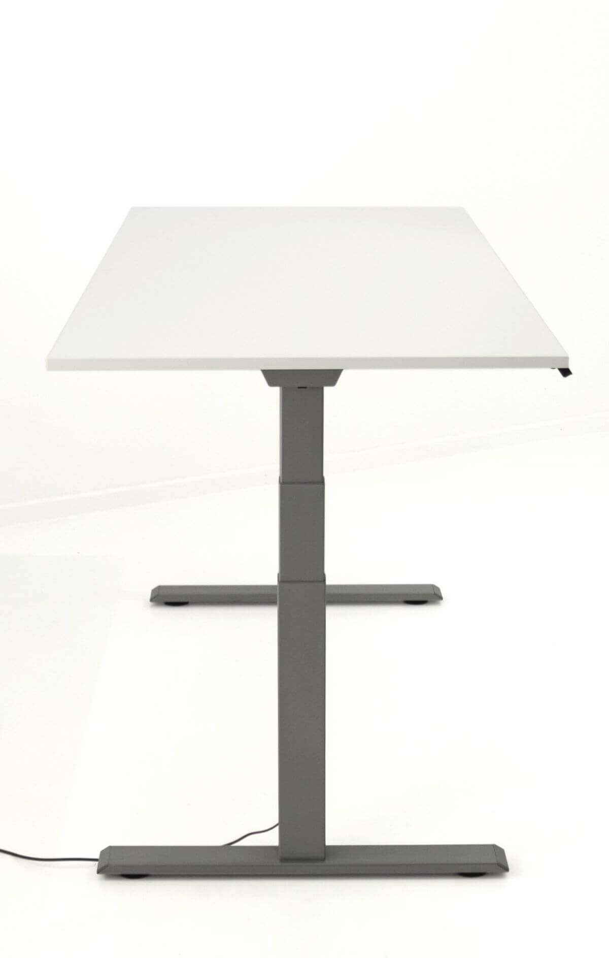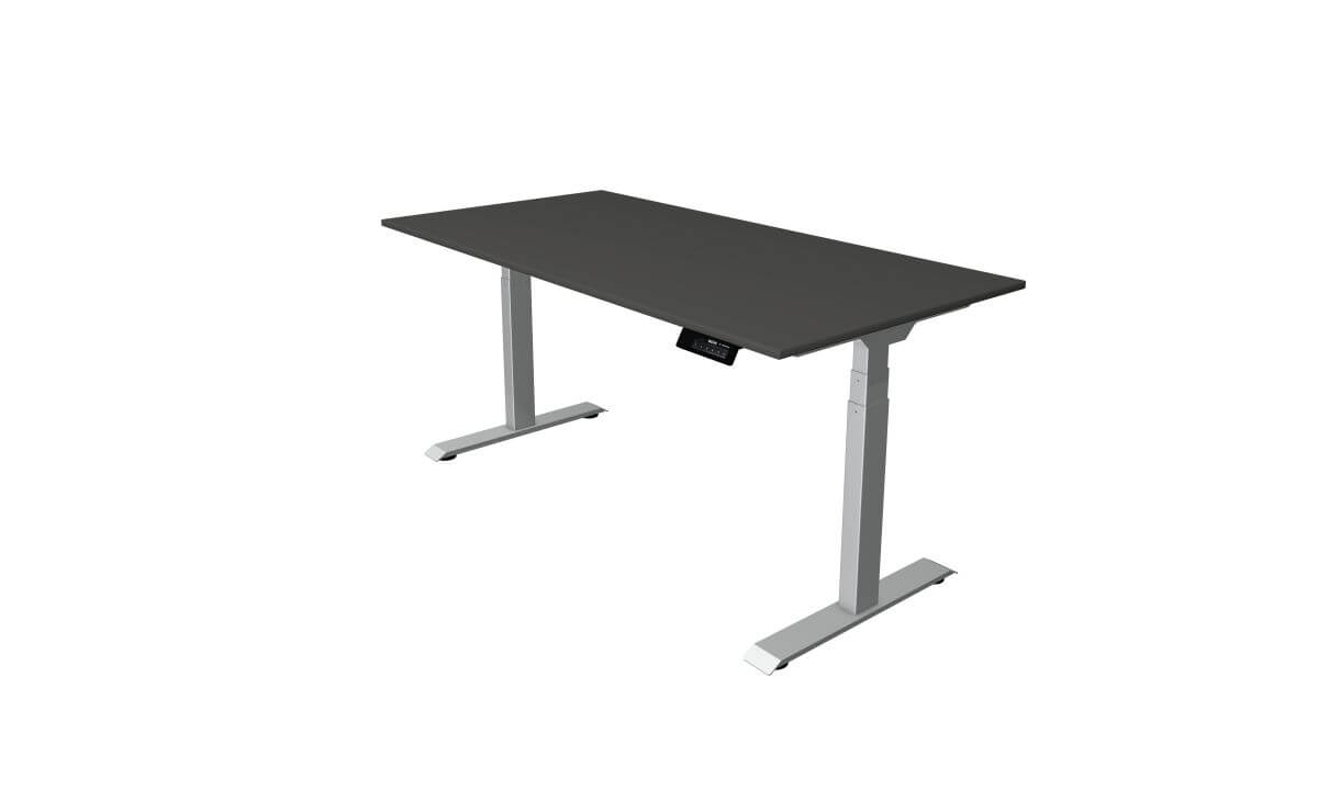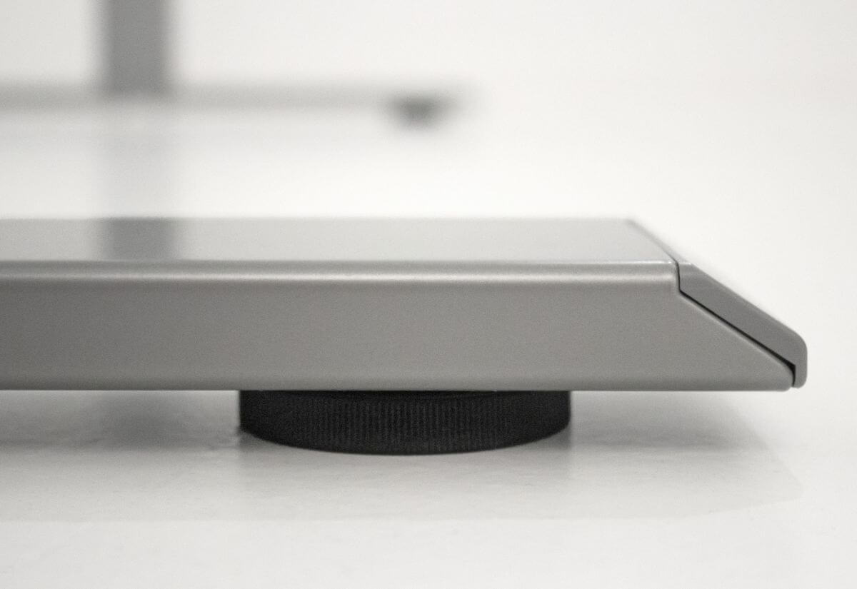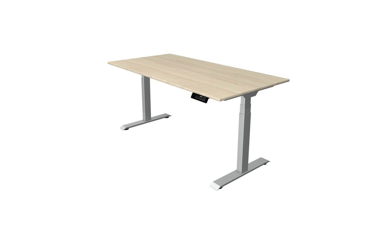 Die Tischplatten sind aus Gütespan gemäß DIN EN 14322. Sie verfügen über eine langlebige Melaminharzbeschichtung und stoßfeste ABS-Kanten. Das Gestell verfügt über 2 Motoren mit Sanft-Anlauf und Sanft-Stopp sowie Kollisionsschutz. Bei Kollision wird jede Bewegung gestoppt und die Säule zurückgefahren. Memory-Funktion mit Höhen-Anzeige, 4 Höhen speicherbar.